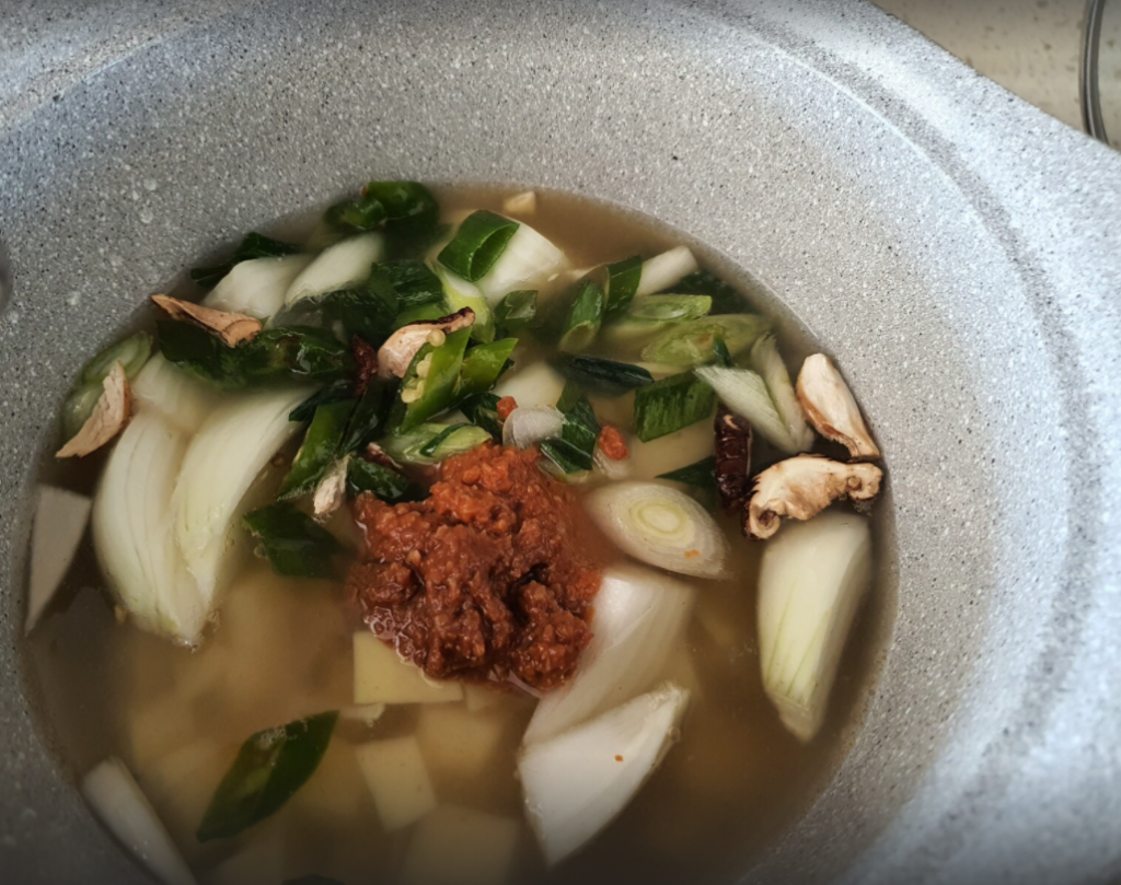 된장( 마트에서 구입했는데 조개맛이 난다고…. ^^ㅎ), 양파 반점, 감자 한개, 표고버섯조금, 대파 한 줌, 다진마늘 조금, 청량고추 조금, 참기름 반스푼
