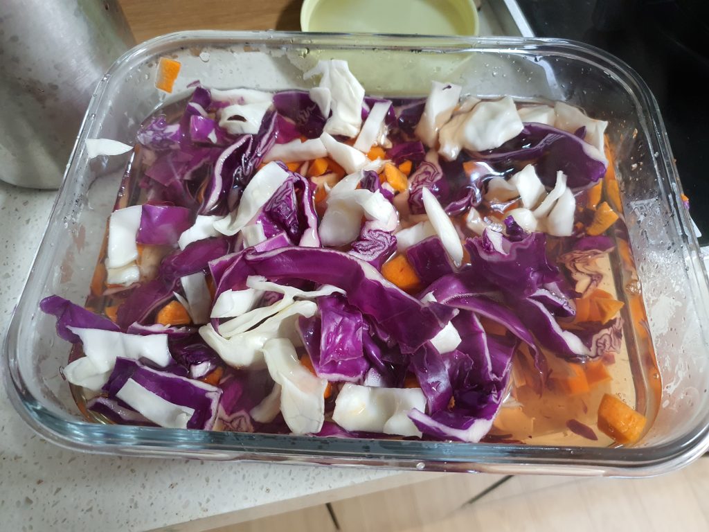 식초물이 끓기 시작하면 준비해 두었던 양배추와 당근위로 식초물을 푹~ 잠길정도로 넣어 준 후 식혀준다.