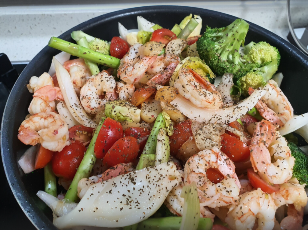 새우가 어느정도 익혀질때 쯤 후추와 바질가루를 첨가해서 향을 내어 주고 소금으로 간을 맞추어 준다.